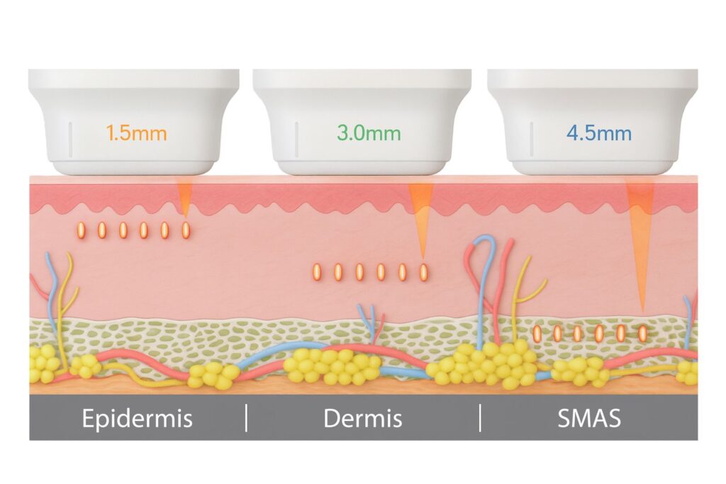 Tijdens de behandeling wordt een geconcentreerde bundel ultrasone energie afgegeven op specifieke dieptes in de huid: